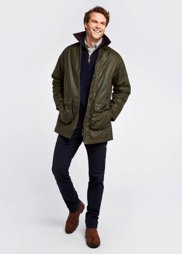 The Brunswick combines traditional wax jacket finish with a longer cut offering extra protection. A contrasting corduroy collar coordinates with leather trim and brings a smart finish to classic country style while large patch pockets allow for city break essentials, a good supply of dog treats or perhaps a Dubarry hipflask to take the nip out of the autumnal air.