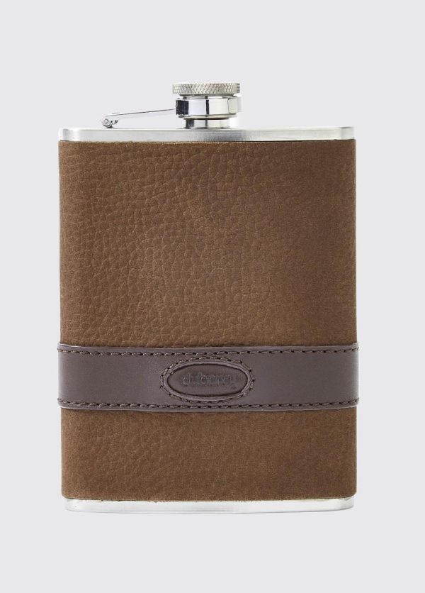 - Leather-bound stainless steel hip flask with hinged screw cap.
