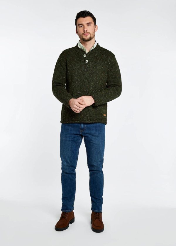A showpiece of beautiful Irish workmanship, the yarn for this rugged sweater was spun in Donegal and shows distinctive flecks throughout the wool. The v-neck, with a wide rib trim and rolled neckline has classic horn button fastenings giving it a quality, traditional feel. A real eye-catching garment it’s perfect weekend away packing, or layer up under a waxed jacket for a winning combination in the wildest of weather.